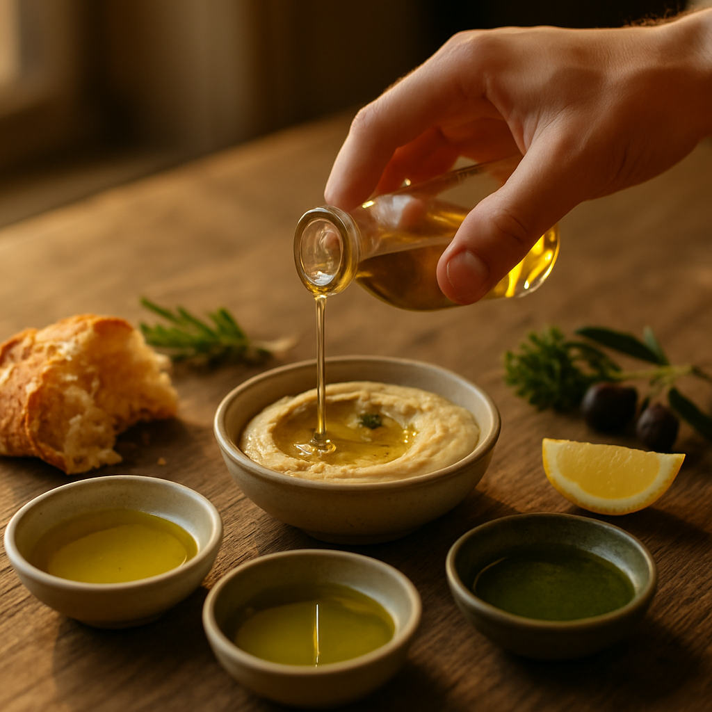 Bieten Sie zu einem Brotbrett mehrere Schälchen mit unterschiedlichen Ölen an: ein mild-fruchtiges Öl, ein nussiges Öl und ein kräftiges, pfeffriges Öl. Fügen Sie Meersalz, frisch gemahlenen Pfeffer, Zitronenzeste oder einen Klecks Tahini hinzu. So entsteht ein interaktives Erlebnis, in dem Gäste ihre Favoriten entdecken können. Dieses gemeinsame Probieren fördert Gespräche und gibt Ihnen die Chance, kleine Geschmacksklassen zu erklären: Warum schmeckt dieses Öl grasiger? Was bewirkt die pfeffrige Schärfe im Abgang?